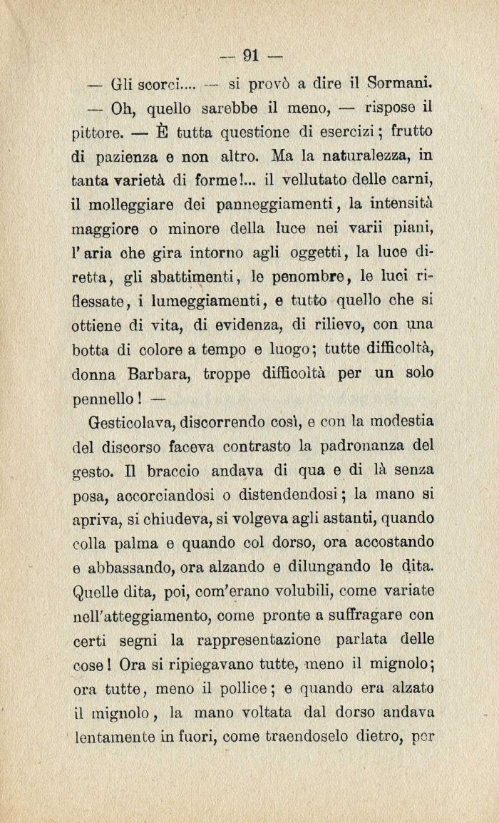 Gesticolava| discorrendo cosi| e con la modestia del discorso faceva contrasto la padronanza del gesto. Il braccio andava di qua e di là senza posa| accorciandosi o distendendosi ; la mano si apriva| si chiudeva| si volgeva agli astanti| quando colla palma e quando col dorso| ora accostando e abbassando| ora alzando e dilungando le dita. Quelle dita| poi| com'erano volubili| come variate nell'atteggiamento| come pronte a suffragare con certi segni la rappresentazione parlata delle cose ! Ora si ripiegavano tutte| meno il mignolo ; ora tutte| meno il pollice ; e quando era alzato il mignolo| la mano voltata dal dorso andava lentamente in fuori| come traendoselo dietro| por