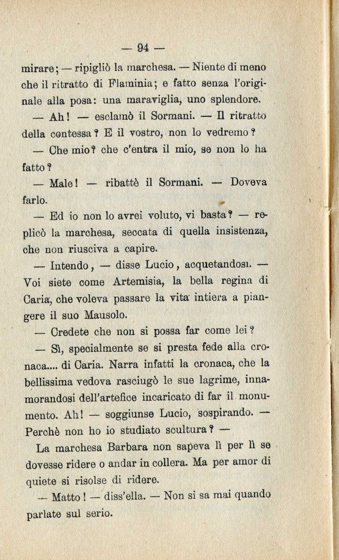 — Sì| speoialmente se si presta fede alla cronaca.... di Caria. Narra infatti la oronaca| che la bellissima vedova rasciugò le sue lagrime| innamorandosi dell'artefice incaricato di far il monumento. Ah! — soggiunse Lucio| sospirando. — Perchè non ho io studiato scultura? —