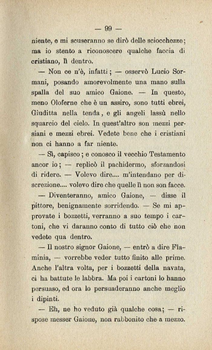 — Non oe n'ò| infatti ; — osservò Lucio Sor-mani| posando amorevolmente una mano sulla spalla del suo amico Gaione. — In questo| meno Oloferne che è un assiro| sono tutti ebrei| Giuditta nella tenda| e gli angeli lassù nello squarcio del cielo. In quest'altro son mezzi persiani e mezzi ebrei. Vedete bene che i cristiani non ci hanno a far niente.