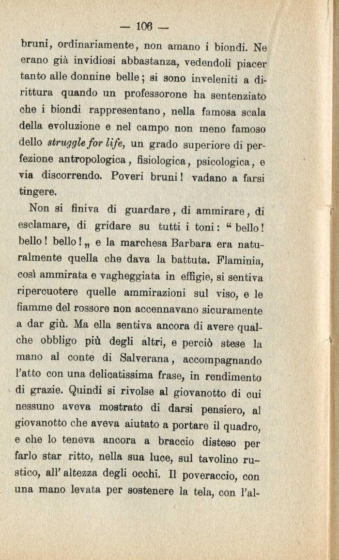 bruni| ordinariamente| non amano i biondi. Ne erano già invidiosi abbastanza| vedendoli piacer tanto alle donnine belle ; si sono inveleniti a dirittura quando un professorone ha sentenziato ohe i biondi rappresentano| nella famosa scala della evoluzione e nel campo non meno famoso dello strugglefor life| un grado superiore di perfezione antropologica| fisiologica| psicologica| e via discorrendo. Poveri bruni ! vadano a farsi tingere.