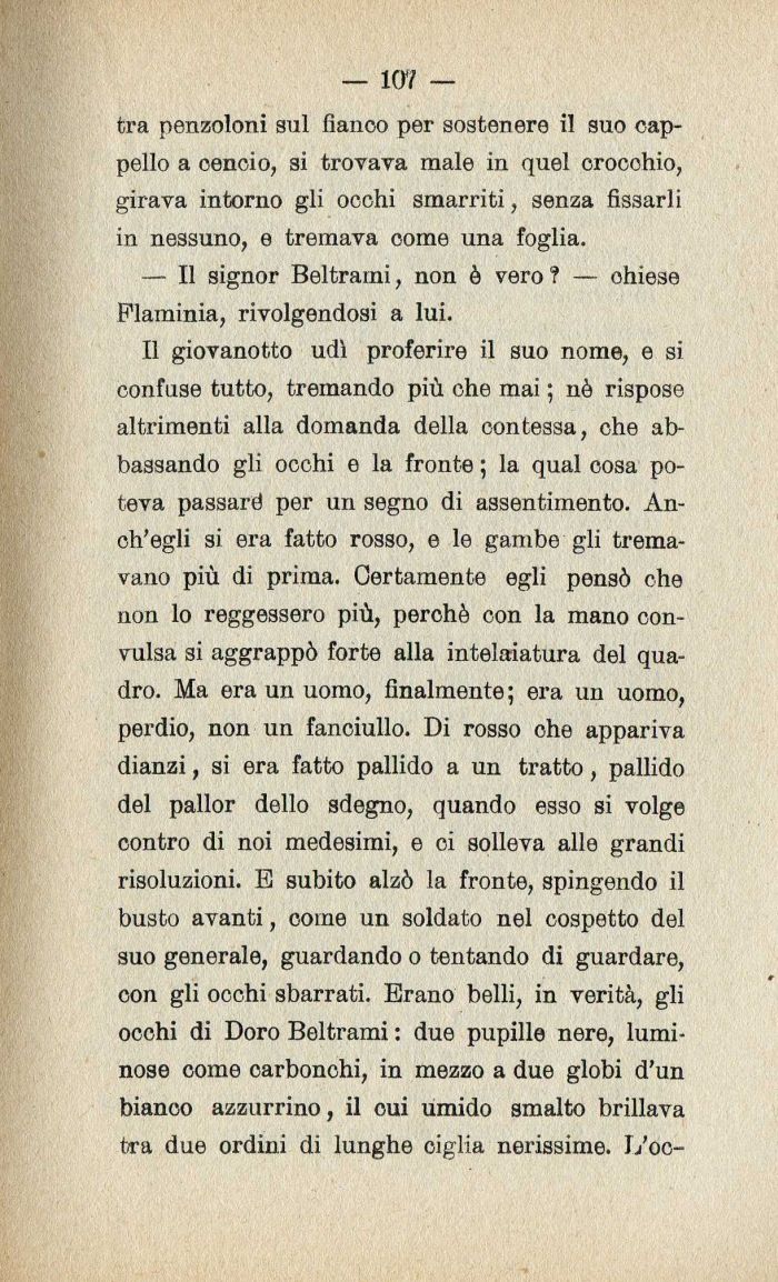 Il giovanotto udì proferire il suo nome| e si confuse tutto| tremando più ohe mai ; nè rispose altrimenti alla domanda della contessa| che abbassando gli occhi e la fronte ; la qual cosa poteva passard per un segno di assentimento. An-oh'egli si era fatto rosso| e le gambe gli tremavano più di prima. Certamente egli pensò che non lo reggessero più| perchè con la mano convulsa si aggrappò forte alla intelaiatura del quadro. Ma era un uomo| finalmente; era un uomo| perdio| non un fanciullo. Di rosso ohe appariva dianzi| si era fatto pallido a un tratto| pallido del pallor dello sdegno| quando esso si volge contro di noi medesimi| e ci solleva alle grandi risoluzioni. E subito alzò la fronte| spingendo il busto avanti| come un soldato nel cospetto del suo generale| guardando o tentando di guardare| con gli occhi sbarrati. Erano belli| in verità| gli occhi di Doro Beltrami : due pupille nere| luminose come carbonchi| in mezzo a due globi d'un bianco azzurrino| il cui umido smalto brillava tra due ordini di lunghe ciglia nerissime. L'oc-