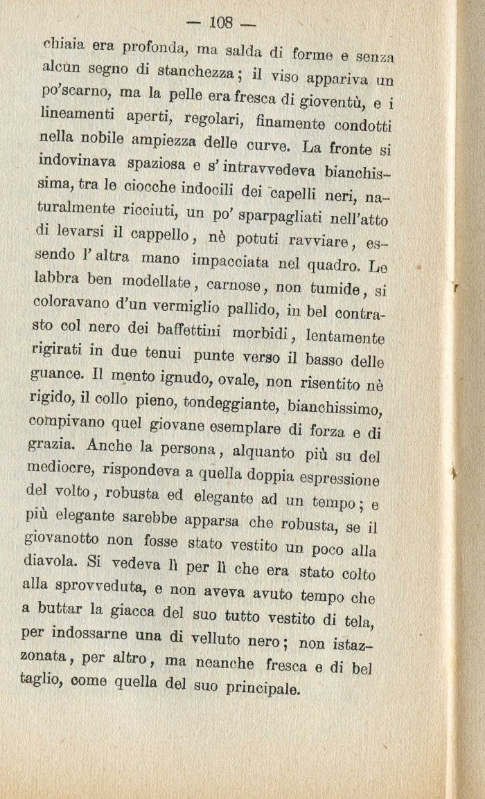 Ghiaia era profonda| ma salda di forme e senza alcun segno di stanchezza; il viso appariva un po'scarno| ma la pelle era fresca di gioventų| e i lineamenti aperti| regolari| finamente condotti nella nobile ampiezza delle curve. La fronte si indovinava spaziosa e s'intravvedeva bianchissima| tra le ciocche indocili dei capelli neri| naturalmente ricciuti| un po' sparpagliati nell'atto di levarsi il cappello| nč potuti ravviare| essendo l'altra mano impacciata nel quadro. Lo labbra ben modellate| carnose| non tumide| si coloravano d'un vermiglio pallido| in bel contrasto col nero dei baffettiui morbidi| lentamente rigirati in due tenui punte verso il basso delle guance. Il mento ignudo| ovale| non risentito nč rigido| il collo pieno| tondeggiante| bianchissimo| compivano quel giovane esemplare di forza e di grazia. Anche la persona| alquanto pių su del mediocre| rispondeva a quella doppia espressione del volto| robusta ed elegante ad un tempo ; e pių elegante sarebbe apparsa che robusta| se il giovanotto non fosse stato vestito un poco alla diavola. Si vedeva 1\ per lė che era stato colto alla sprovveduta| e non aveva avuto tempo che a buttar la giacca del suo tutto vestito di tela| per indossarne una di velluto nero; non istaz-zonata| per altro| ma neanche fresca e di bel taglio| come quella del suo principale.