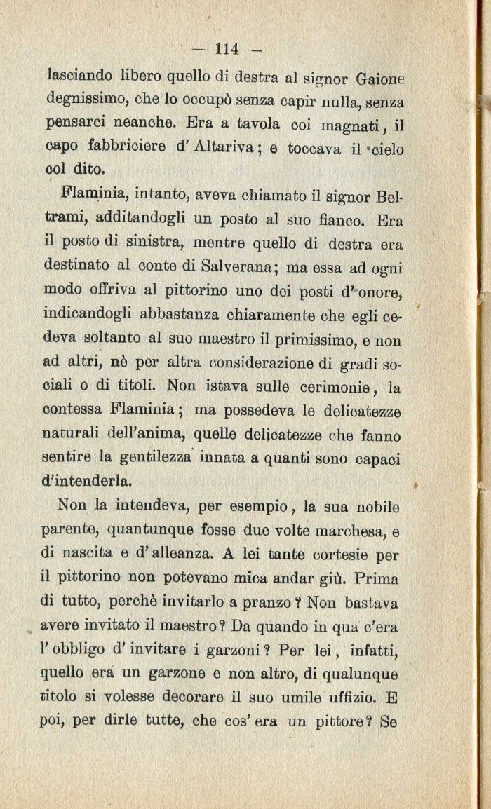 Flaminia| intanto| aveva chiamato il signor Bel-trami| additandogli un posto al suo fianco. Era il posto di sinistra| mentre quello di destra era destinato al conte di Salverana; ma essa ad ogni modo offriva al pittorino uno dei posti d' onore| indicandogli abbastanza chiaramente che egli cedeva soltanto al suo maestro il primissimo| e non ad altri| nò per altra considerazione di gradi sociali o di titoli. Non istava sulle cerimonie| la contessa Flaminia ; ma possedeva le delicatezze naturali dell'anima| quelle delicatezze che fanno sentire la gentilezza innata a quanti sono capaci d'intenderla. ?