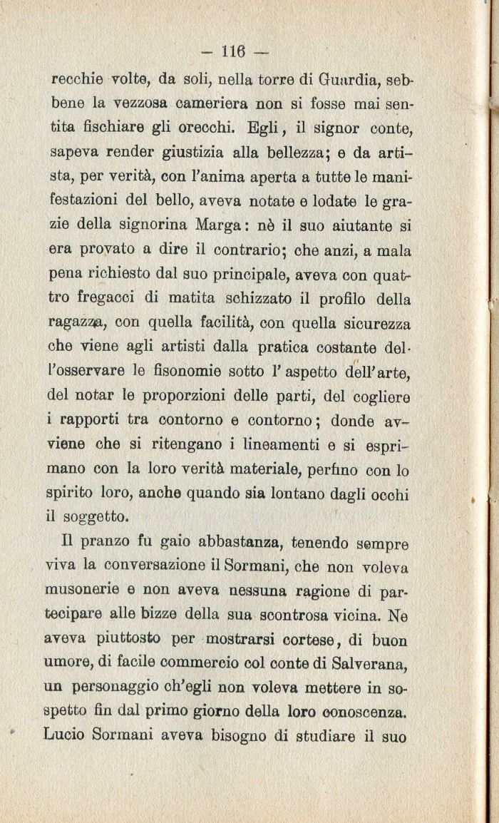 recohie volte| da soli| nella torre di Guardia| sebbene la vezzosa cameriera non si fosse mai sentita fischiare gli orecchi. Egli| il signor conte| sapeva render giustizia alla bellezza; e da artista| per verità| con l'anima aperta a tutte le manifestazioni del bello| aveva notate e lodate le grazie della signorina Marga: nò il suo aiutante si era provato a dire il contrario; che anzi| a mala pena richiesto dal suo principale| aveva con quattro fregacci di matita schizzato il profilo della ragazzja| con quella facilità| con quella sicurezza che viene agli artisti dalla pratica costante dell'osservare le fisonomie sotto l'aspetto dell'arte| del notar le proporzioni delle parti| del cogliere i rapporti tra contorno e contorno ; donde avviene che si ritengano i lineamenti e si esprimano con la loro verità materiale| perfino con lo spirito loro| anche quando sia lontano dagli occhi il soggetto.