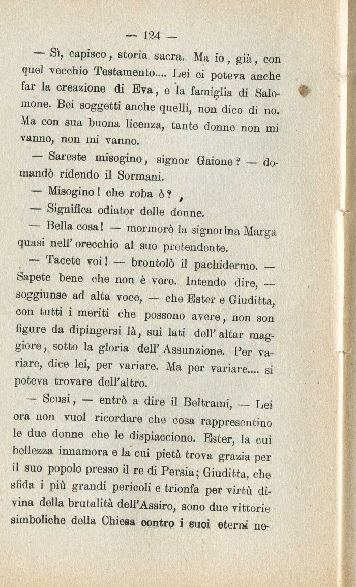 — Scusi| — entrò a dire il Beltrami| — Lei ora non vuol ricordare ohe cosa rappresentino le due donne ohe le dispiacciono. Ester| la cui bellezza innamora e la cui pietà trova grazia per il suo popolo presso il re di Persia ; Giuditta| che sfida i più grandi pericoli e trionfa per virtù divina della brutalità dell'Assiro| sono due vittorie simboliche della Chiesa oontro i suoi eterni ne-