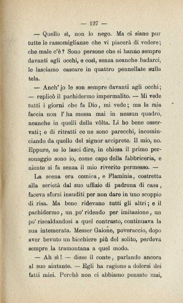 — Quello sì| non lo nego. Ma oi siano pur tutte le rassomiglianze ohe vi piacerà di vedere ; ohe male c'è ? Sono persone che si hanno sempre davanti agli ocohi| e così| senza neanche badarci| le lasciamo cascare in quattro pennellate sulla tela.