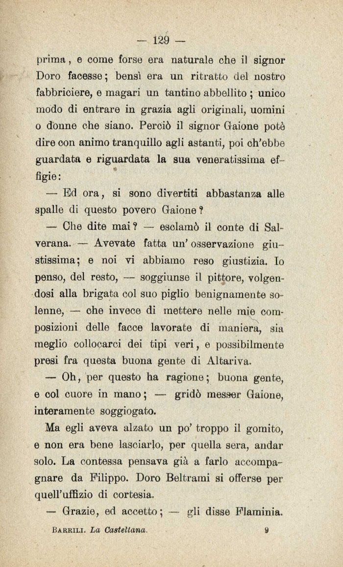 — Clie dite mai? — esclamò il conte di Salverana. — Avevate fatta un' osservazione giustissima; e noi vi abbiamo reso giustizia. Io penso| del resto| — soggiunse il pittore| volgendosi alla brigata col suo piglio benignamente solenne| — ohe invece di mettere nelle mie composizioni delle facce lavorate di maniera| sia meglio collocarci dei tipi veri| e possibilmente presi fra questa buona gente di Altariva.