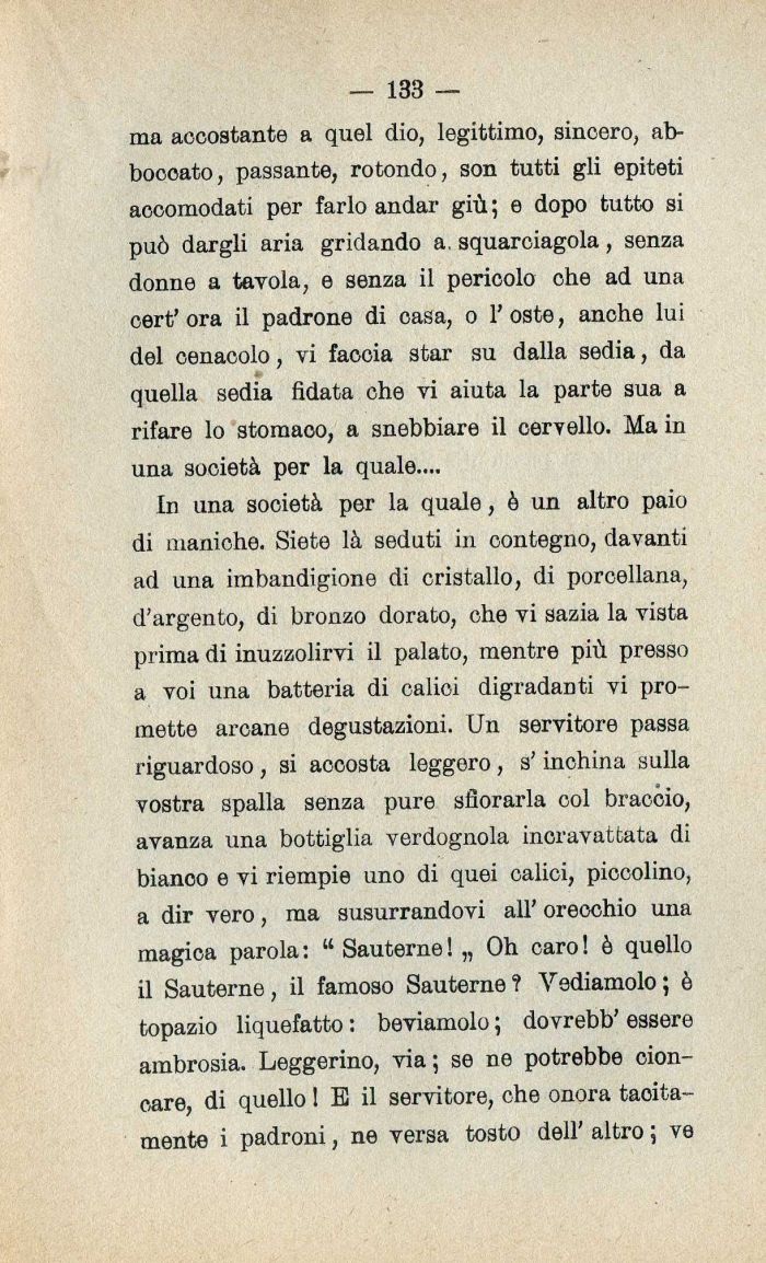 In una società per la quale| è un altro paio di maniche. Siete là seduti in contegno| davanti ad una imbandigione di cristallo| di porcellana| d'argento| di bronzo dorato| che vi sazia la vista prima di inuzzolirvi il palato| mentre più presso a voi una batteria di calici digradanti vi promette arcane degustazioni. Un servitore passa riguardoso| si accosta leggero| s'inchina sulla vostra spalla senza pure sfiorarla col braccio| avanza una bottiglia verdognola incravattata di bianoo e vi riempie uno di quei calici| piccolino| a dir vero| ma susurrandovi all' orecchio una magica parola : ' Sauterne ! „ Oh caro ! è quello il Sauterne| il famoso Sauterne ? Vediamolo ; è topazio liquefatto : beviamolo ; dovrebb' essere ambrosia. Leggerino| via ; se ne potrebbe cioncare| di quello 1 E il servitore| che onora tacitamente i padroni| ne versa tosto dell' altro ; ve