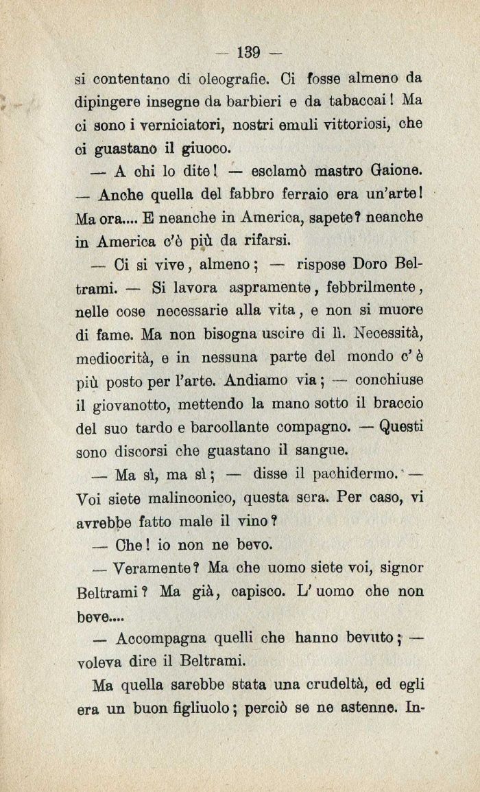 — Oi si vive| almeno ; — rispose Doro Beltrami. — Si lavora aspramente| febbrilmente| nelle cose necessarie alla vita| e non si muore di fame. Ma non bisogna uscire di lì. Necessità| mediocrità| e in nessuna parte del mondo c' è più posto per l'arte. Andiamo via ; — conohiuse il giovanotto| mettendo la mano sotto il braccio del suo tardo e barcollante compagno. — Questi sono discorsi che guastano il sangue.