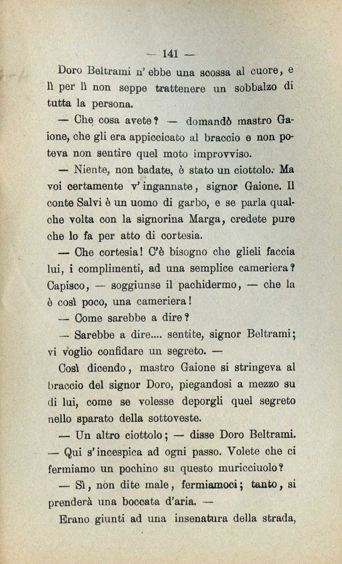 — Niente| non badate| ò stato un ciottolo. Ma voi certamente v' ingannate| signor Gaione. Il conte Salvi è un uomo di garbo| e se parla qualche volta con la signorina Marga| credete pure che lo fa per atto di cortesia.