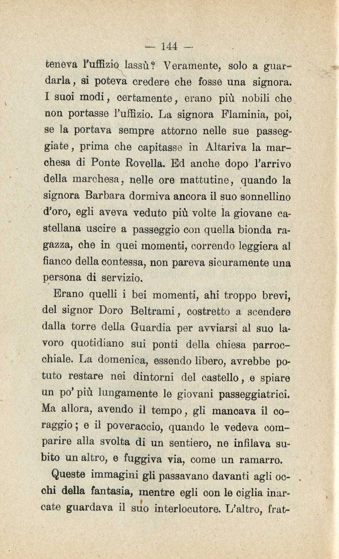 Erano quelli i bei momenti| ahi troppo brevi| del signor Doro Beltrami| costretto a scendere dalla torre della Guardia per avviarsi al suo lavoro quotidiano sui ponti della chiesa parrocchiale. La domenica| essendo libero| avrebbe potuto restare nei dintorni del castello| e spiare un po'più lungamente le giovani passeggiatrici. Ma allora| avendo il tempo| gli mancava il coraggio; e il poveraccio| quando le vedeva comparire alla svolta di un sentiero| ne infilava subito un altro| e fuggiva via| come un ramarro.