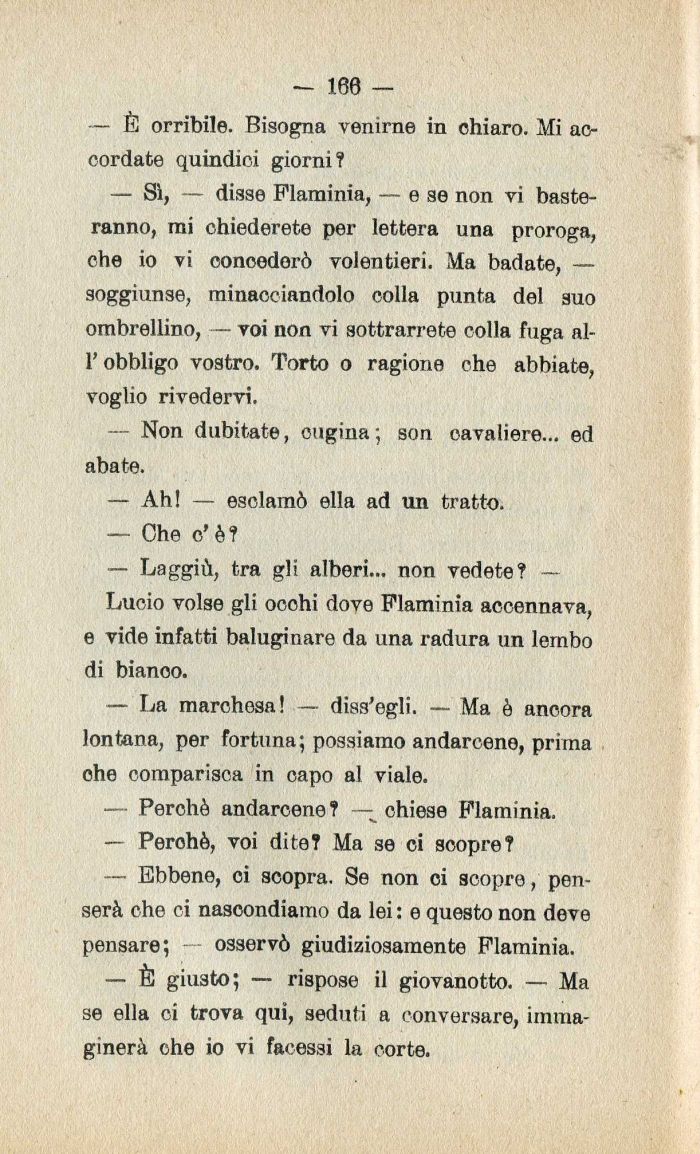 — Sì| — disse Flaminia| — e se non ri basteranno| mi chiederete per lettera una proroga| che io vi conoedorò volentieri. Ma badate| — soggiunse| minacciandolo colla punta del suo ombrellino| — voi non vi sottrarrete colla fuga all' obbligo vostro. Torto o ragione che abbiate| voglio rivedervi.