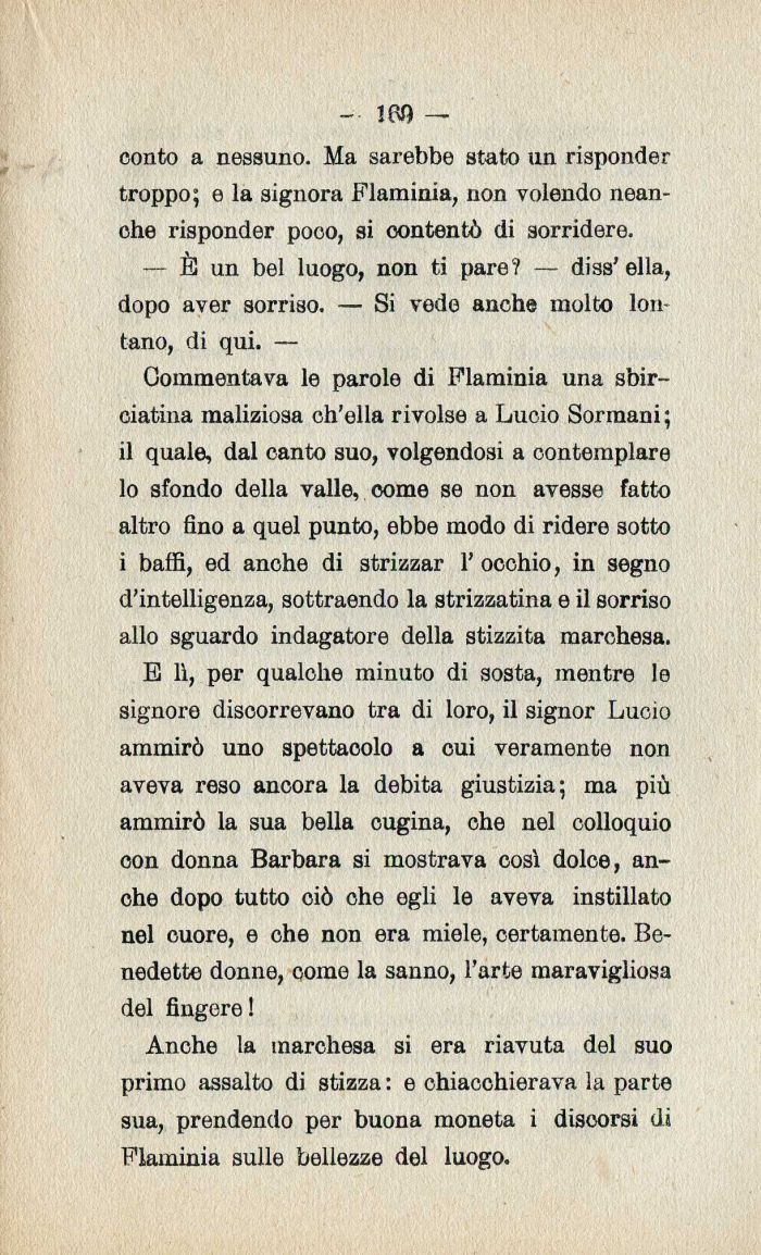 Anche la marchesa si era riavuta del suo primo assalto di stizza : e chiacchierava la parte sua| prendendo per buona moneta i disoorsi di Flaminia sulle bellezze del luogo.