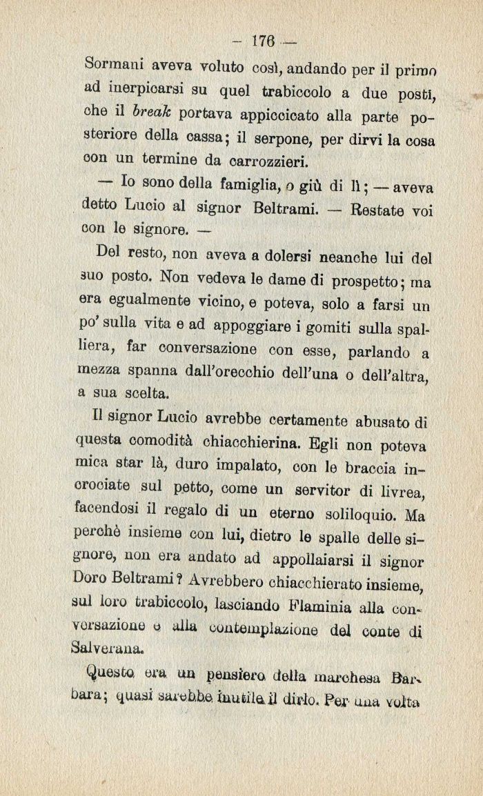 Il signor Lucio avrebbe certamente abusato di questa comodità chiacchierina. Egli non poteva mica star là| duro impalato| con le braccia incrociate sul petto| come un servitor di livrea| facendosi il regalo di un eterno soliloquio. Ma perchè insieme con lui| dietro le spalle delle signore| non era andato ad appollaiarsi il signor Doro Beltrami ? Avrebbero chiacchierato insieme| sul loro trabiccolo| lasciando Flaminia alla conversazione o alla contemplazione del conte di Salverana.