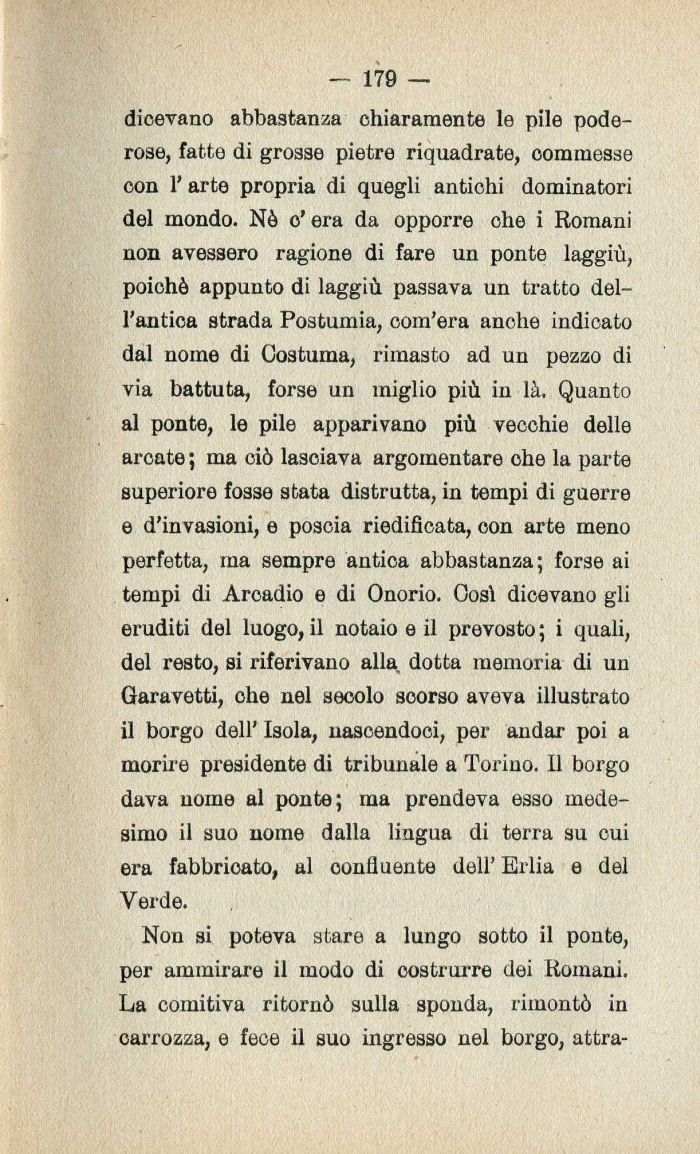 dicevano abbastanza chiaramente le pile poderose| fatte di grosse pietre riquadrate| commesse con l'arte propria di quegli antichi dominatori del mondo. Nò o' era da opporre che i Romani non avessero ragione di fare un ponte laggiù| poiché appunto di laggiù passava un tratto dell'antica strada Postumia| com'era anche indicato dal nome di Costuma| rimasto ad un pezzo di via battuta| forse un miglio più in là. Quanto al ponte| le pile apparivano più vecchie delle arcate ; ma ciò lasciava argomentare che la parte superiore fosse stata distrutta| in tempi di guerre e d'invasioni| e poscia riedificata| con arte meno perfetta| ma sempre antica abbastanza; forse ai tempi di Arcadio e di Onorio. Cosi dicevano gli eruditi del luogo| il notaio e il prevosto; i quali| del resto| si riferivano alla| dotta memoria di un Garavetti| che nel secolo soorso aveva illustrato il borgo dell' Isola| nascendoci| per andar poi a morire presidente di tribunale a Torino. 11 borgo dava nome al ponte; ma prendeva esso medesimo il suo nome dalla lingua di terra su cui era fabbricato| al oonlluente dell' Erlia e del Verde.