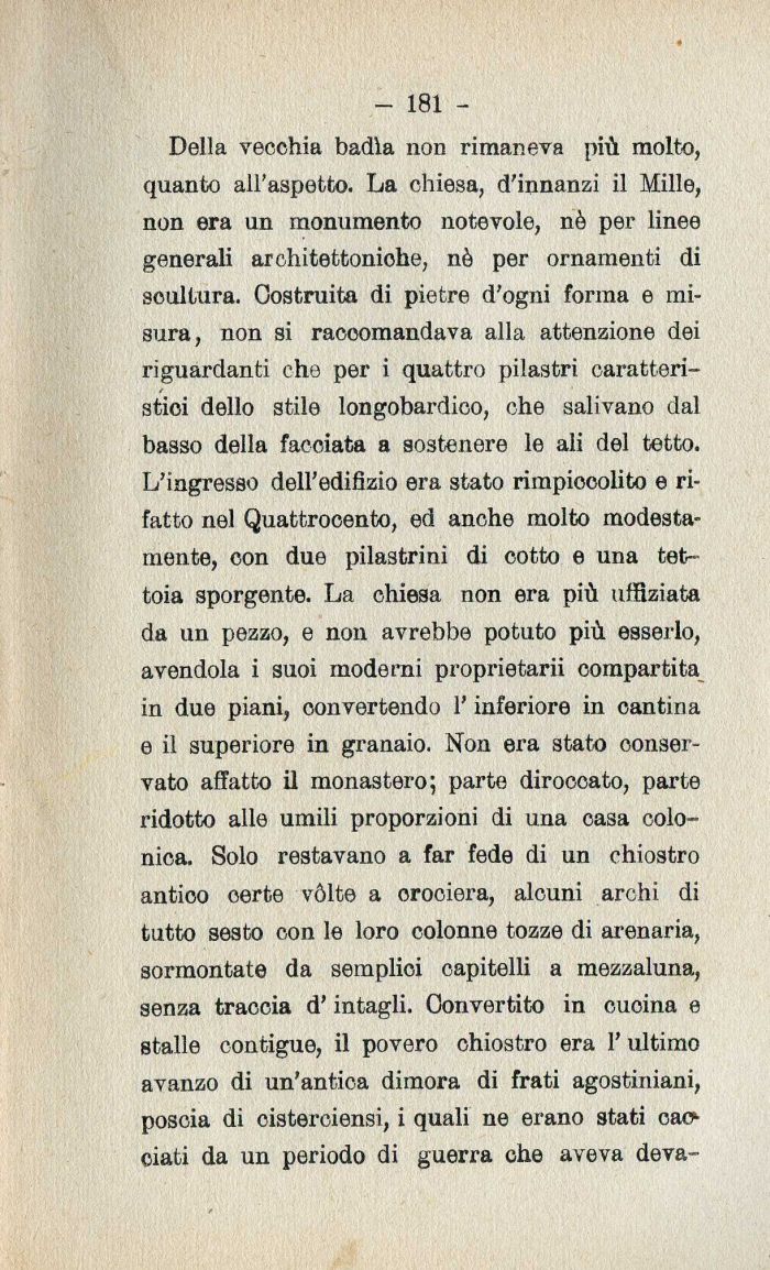 Della vecchia badia non rimaneva pių molto| quanto all'aspetto. La chiesa| d'innanzi il Mille| non era un monumento notevole| nč per linee generali architettoniohe| nč per ornamenti di scultura. Costruita di pietre d'ogni forma e misura| non si racoomandava alla attenzione dei riguardanti che per i quattro pilastri caratteristici dello stile longobardico| che salivano dal basso della facciata a sostenere le ali del tetto. L'ingresso dell' edilėzio era stato rimpiccolito e rifatto nel Quattrocento| ed anche molto modestamente| con due pilastrini di cotto e una tettoia sporgente. La chiesa non era pių uffiziata da un pezzo| e non avrebbe potuto pių esserlo| avendola i suoi moderni proprietarii compartita in due piani| oonvertendo l'inferiore in cantina e il superiore in granaio. Non era stato conservato affatto il monastero; parte diroooato| parte ridotto alle umili proporzioni di una casa colonica. Solo restavano a far fede di un chiostro antico oerte vōlte a orociera| alcuni archi di tutto sesto con le loro colonne tozze di arenaria| sormontate da semplici capitelli a mezzaluna| senza traccia d'intagli. Convertito in cucina e stalle contigue| il povero chiostro era 1' ultimo avanzo di un'antica dimora di frati agostiniani| poscia di oisterciensi| i quali ne erano stati cacciati da un periodo di guerra che aveva deva-