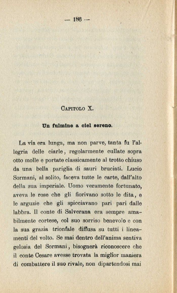 La via era lunga| ma non parve| tanta fu l'allegria delle ciarle| regolarmente cullate sopra otto molle e portate classicamente al trotto chiuso da una bella pariglia di sauri bruciati. Luoio Sormani| al solito| faceva tutte le carte| dall'alto della sua imperiale. Uomo veramente fortunato| aveva le rose che gli fiorivano sotto le dita| e le arguzie ohe gli spicciavano pari pari dalle labbra. Il conte di Salverana era sempre amabilmente cortese| col svio sorriso benevolo e con la sua grazia trionfale diffusa su tutti i lineamenti del volto. Se mai dentro dell'anima sentiva gelosia del Sormani| bisognerą riconoscere che il conte Cesare avesse trovata la miglior maniera di combattere il suo rivale| non dipartendosi mai