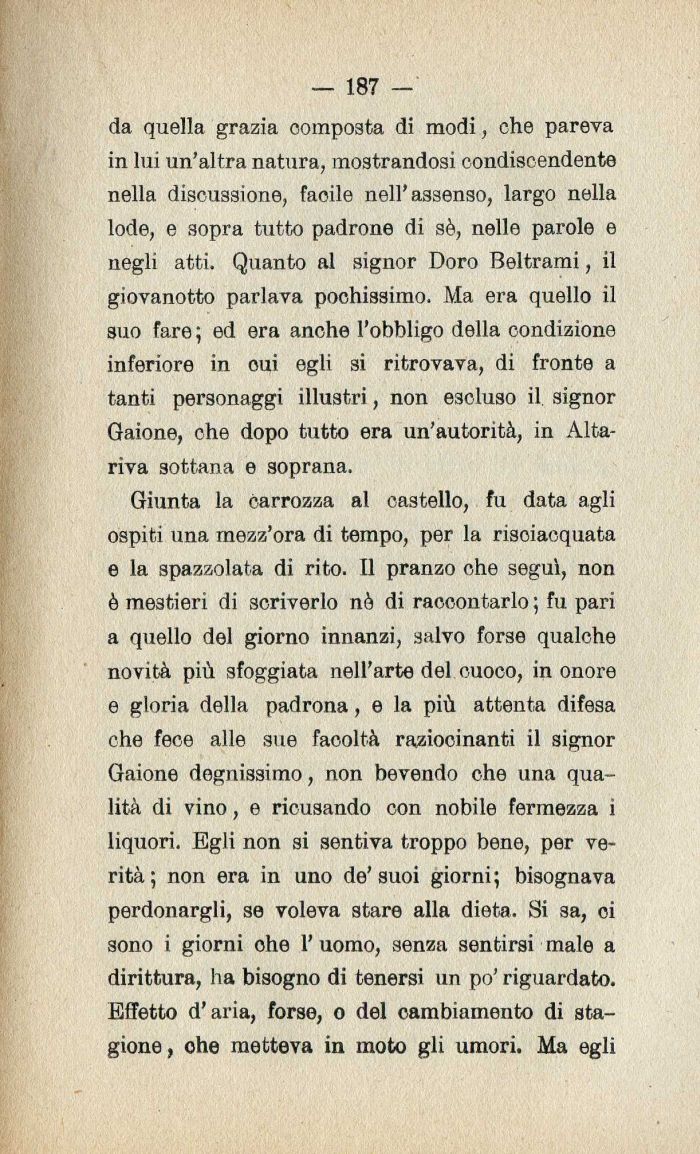 da quella grazia composta di modi| che pareva in lui un'altra natura| mostrandosi condiscendente nella discussione| faoile nell'assenso| largo nella lode| e sopra tutto padrone di sè| nelle parole e negli atti. Quanto al signor Doro Beltrami| il giovanotto parlava pochissimo. Ma era quello il suo fare ; ed era anche l'obbligo della condizione inferiore in oui egli si ritrovava| di fronte a tanti personaggi illustri| non escluso il signor Gaione| ohe dopo tutto era un'autorità| in Altariva sottana e soprana.