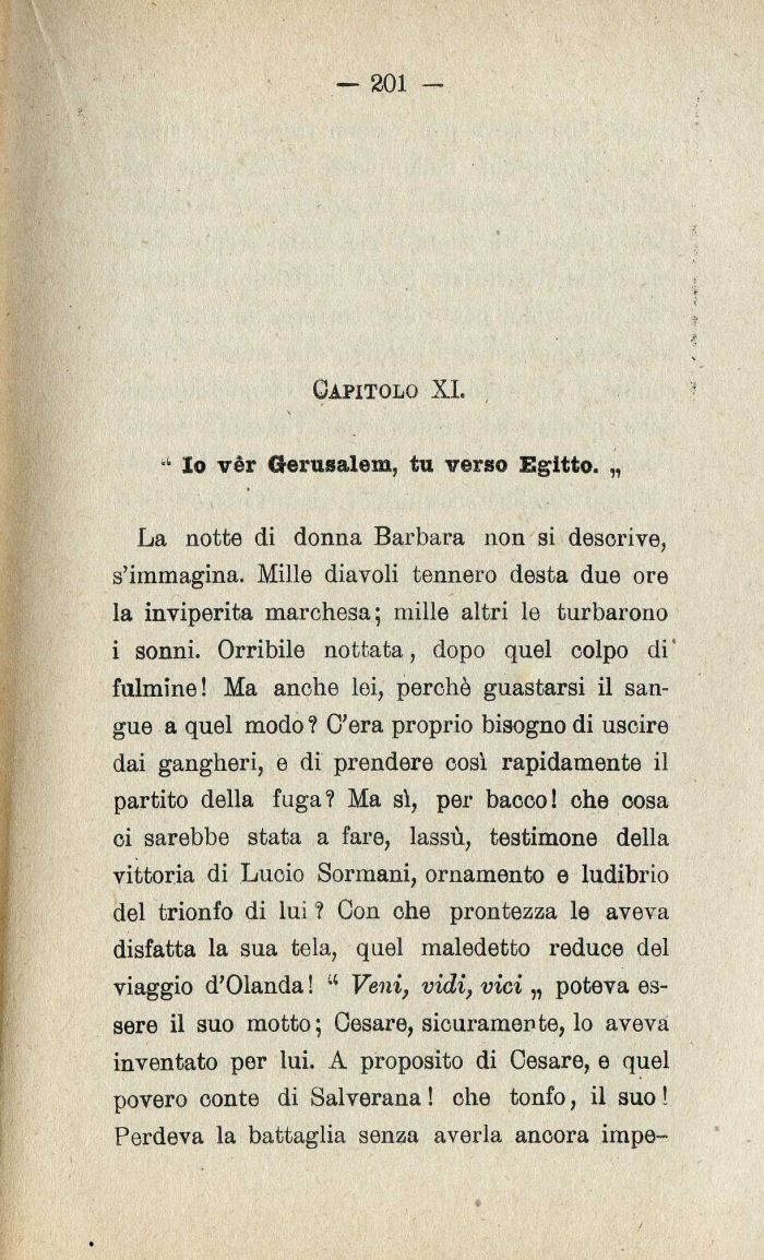 La notte di donna Barbara non si descrive| s'immagina. Mille diavoli tennero desta due ore la inviperita marchesa; mille altri le turbarono i sonni. Orribile nottata| dopo quel colpo di ' fulmine! Ma anohe lei| perchè guastarsi il sangue a quel modo ? C'era proprio bisogno di uscire dai gangheri| e di prendere così rapidamente il partito della fuga? Ma sì| per bacco! che oosa ci sarebbe stata a fare| lassù| testimone della vittoria di Lucio Sormani| ornamento e ludibrio del trionfo di lui ? Con ohe prontezza le aveva disfatta la sua tela| quel maledetto reduce del viaggio d'Olanda ! ' Veni| vidi| vici „ poteva essere il suo motto; Cesare| sicuramente| lo aveva inventato per lui. A proposito di Cesare| e quel povero conte di Salverana ! che tonfo| il suo ! Perdeva la battaglia senza averla ancora impe-