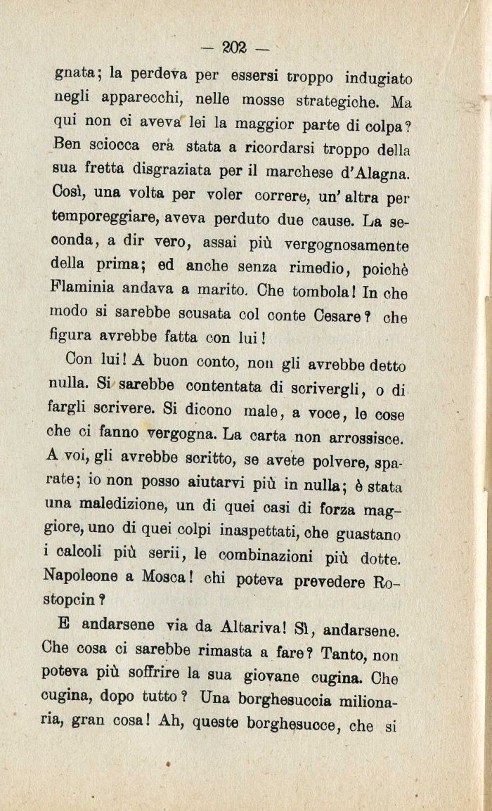 Con lui! A buon conto| non gli avrebbe detto nulla. Si sarebbe contentata di scrivergli| o di fargli scrivere. Si dicono male| a voce| le cose ohe ci fanno vergogna. La carta non arrossisce. A voi| gli avrebbe soritto| se avete polvere| sparate; io non posso aiutarvi più in nulla; è stata una maledizione| un di quei oasi di forza maggiore| uno di quei colpi inaspettati| che guastano i calcoli più serii| le combinazioni più dotte. Napoleone a Mosca! chi poteva prevedere Ro-stopcin ?