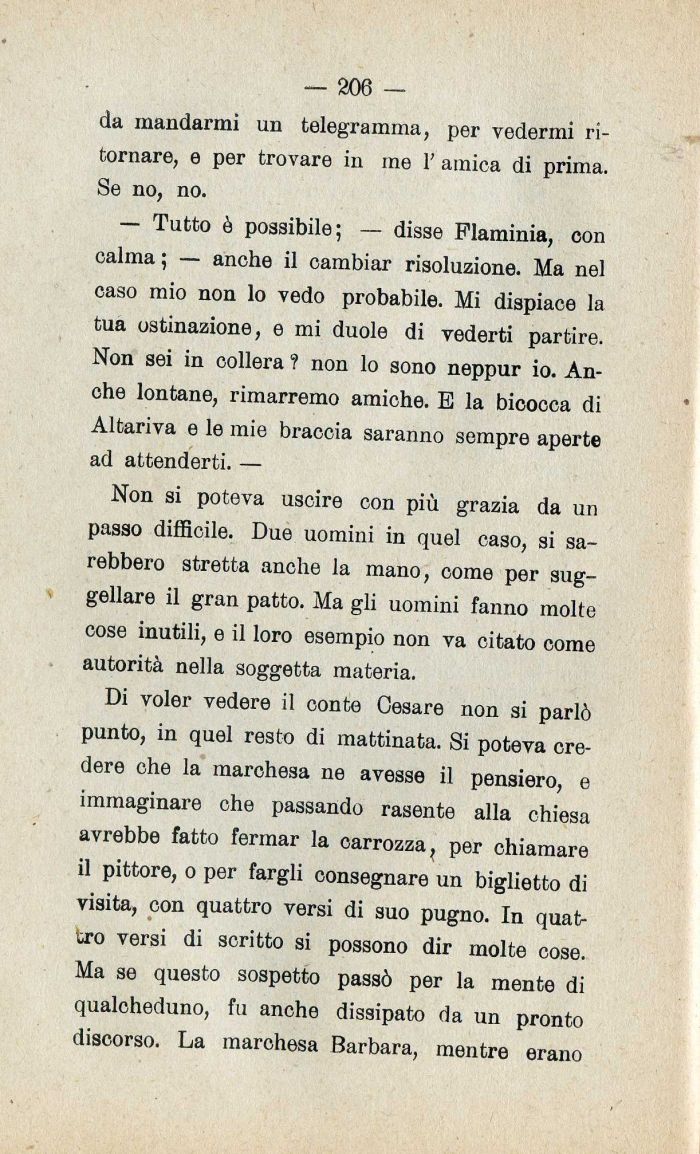 — Tutto è possibile; — disse Flaminia| con calma ; — anche il cambiar risoluzione. Ma nel caso mio non lo vedo probabile. Mi dispiace la tua ostinazione| e mi duole di vederti partire. Non sei in collera ? non lo sono neppur io. Anche lontane| rimarremo amiche. E la bicocca di Altariva e le mie braccia saranno sempre aperte ad attenderti. —