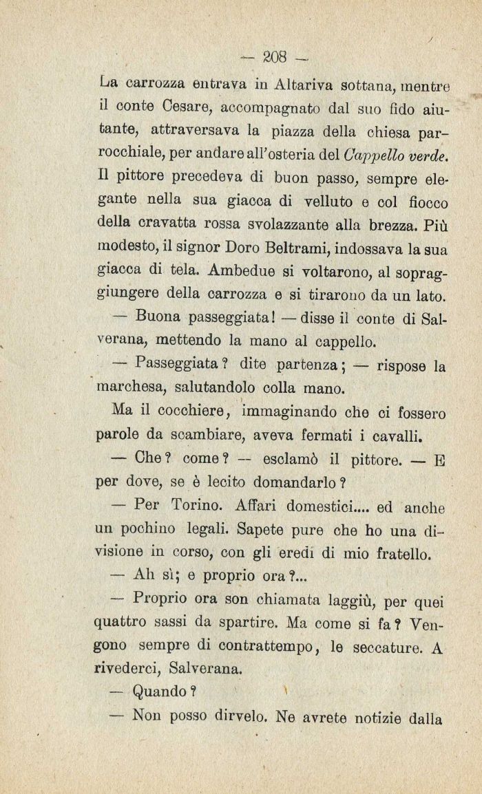 La carrozza entrava in Altariva sottana| mentre il conte Cesare| accompagnato dal suo fido aiutante| attraversava la piazza della chiesa parrocchiale| per andare all'osteria del Cappello verde. Il pittore precedeva di buon passo| sempre elegante nella sua giacca di velluto e col fiocco della cravatta rossa svolazzante alla brezza. Più modesto| il signor Doro Beltrami| indossava la sua giacca di tela. Ambedue si voltarono| al sopraggiungere della carrozza e si tirarono da un lato.