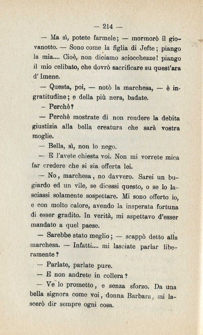 — Ma sì| potete farmele; — mormorò il giovanotto. — Sono oome la figlia di Jefte ; piango la mia.... Cioè| non dioiamo sciocchezze! piango il mio celibato| ohe dovrò sacrificare su quest'ara d'Imene.