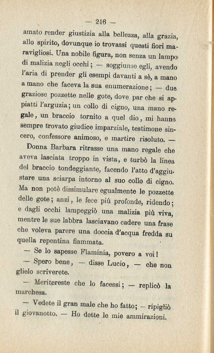 amato render giustizia alla bellezza| alla grazia| allo spirito| dovunque io trovassi questi fiori ma-ravigliosù Una nobile figura| non senza un lampo di malizia negli occhi ; — soggiunse egli| avendo l'aria di prender gli esempi davanti a sè| a mano a mano ohe faceva la sua enumerazione ; — duo graziose pozzette nelle gote| dove par ohe si appiatti l'arguzia; un collo di cigno| una mano regale | un bracoio tornito a quel dio| mi hanno sempre trovato giudice imparziale| testimone sincero| confessore animoso| e martire risoluto. —
