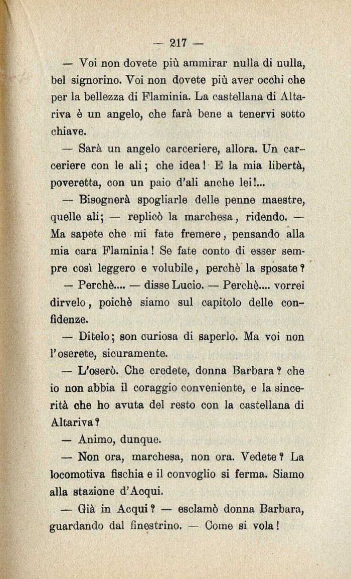 — Non ora| marchesa| non ora. Vedete ? La locomotiva fischia e il convoglio si ferma. Siamo alla stazione d'Acqui.