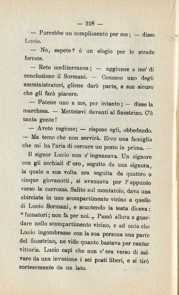 Il signor Lucio non s'ingannava. Un signore con gli occhiali d' oro| seguito da una signora| la quale a sua volta era seguita da quattro o cinque giovanotti| si avanzava per l'appunto verso la carrozza. Salito sul montatoio| dava una sbirciata in uno scompartimento vicino a quello di Lucio Sormani| e scuotendo la testa diceva : ' fumatori ; non fa per noi. „ Passò allora a guardare nello scompartimento vicino| e ad onta che Lucio ingombrasse con la sua persona una parte del finestrino| ne vide quanto bastava per cantar vittoria. Lucio capi che non c' era verso di salvare da una invasione i sei posti liberi| e si tirò cortesemente da un lato.