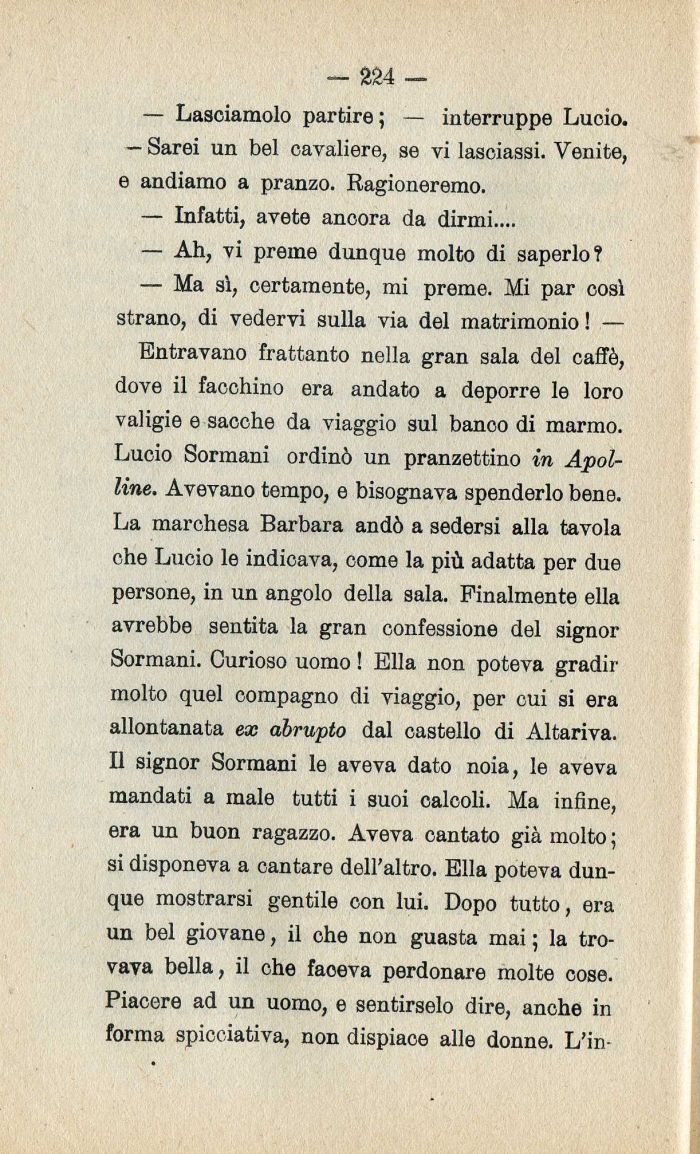 Entravano frattanto nella gran sala del caffè| dove il facchino era andato a deporre le loro valigie e sacche da viaggio sul banoo di marmo. Lucio Sormani ordinò un pranzettino in Apolline. Avevano tempo| e bisognava spenderlo bene. La marchesa Barbara andò a sedersi alla tavola che Lucio le indicava| come la più adatta per due persone| in un angolo della sala. Finalmente ella avrebbe sentita la gran confessione del signor Sormani. Curioso uomo ! Ella non poteva gradir molto quel compagno di viaggio| per cui si era allontanata ex abrupto dal castello di Altariva. Il signor Sormani le aveva dato noia| le aveva mandati a male tutti i suoi calcoli. Ma infine| era un buon ragazzo. Aveva cantato già molto; si disponeva a cantare dell'altro. Ella poteva dunque mostrarsi gentile con lui. Dopo tutto| era un bel giovane| il che non guasta mai ; la trovava bella| il che faoeva perdonare molte cose. Piacere ad un uomo| e sentirselo dire| anche in forma spicciativa| non dispiace alle donne. L'in-