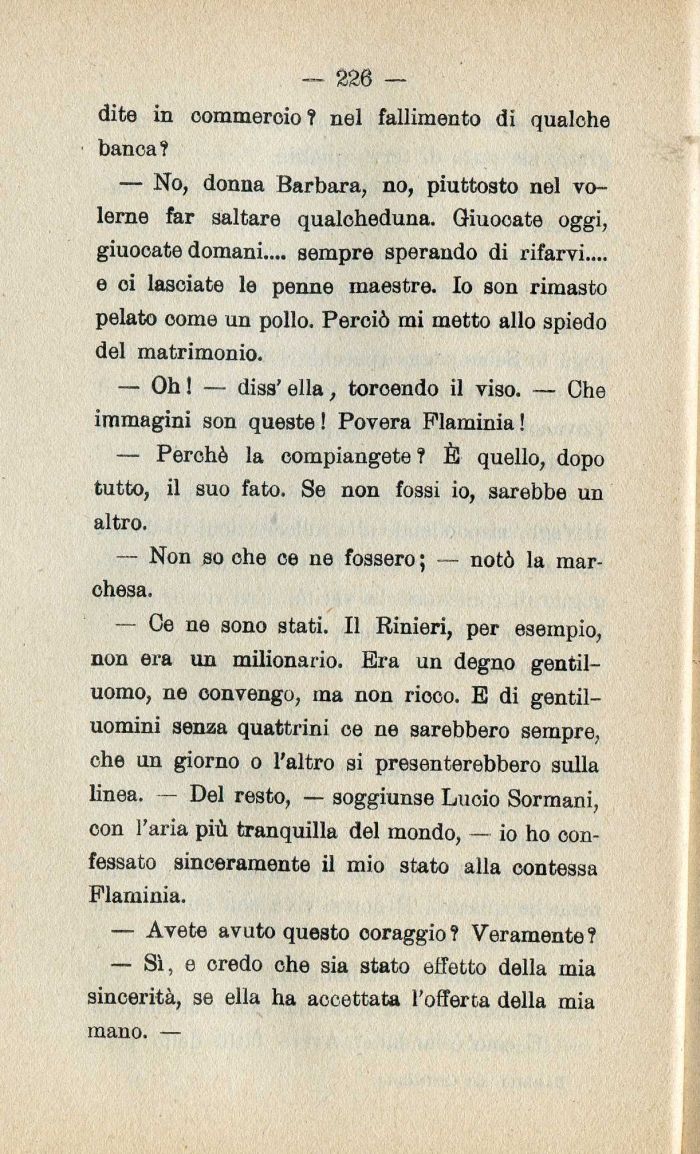 — No| donna Barbara| no| piuttosto nel volerne far saltare qualcheduna. Qiuocate oggi| giuocate domani.... sempre sperando di rifarvi.... e ci lasciate le penne maestre. Io son rimasto pelato oome un pollo. Perciò mi metto allo spiedo del matrimonio.