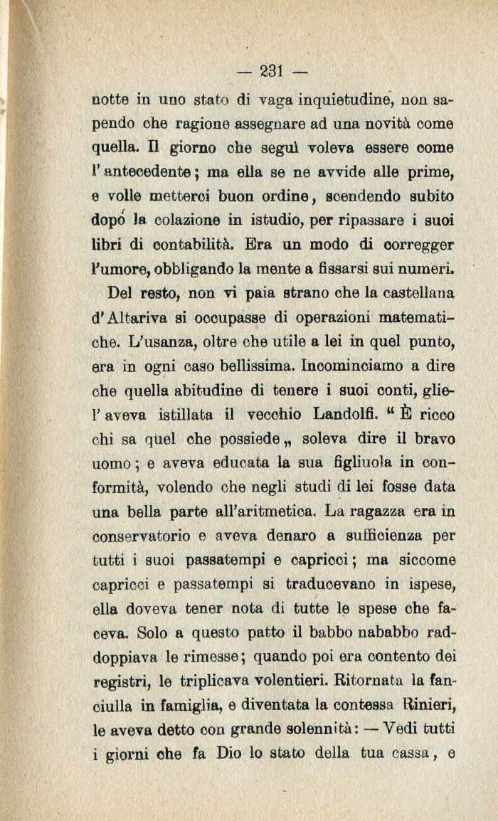 Del resto| non vi paia strano che la castellana d'Altariva si occupasse di operazioni matematiche. L'usanza| oltre che utile a lei in quel punto| era in ogni caso bellissima. Inoominciamo a dire ohe quella abitudine di tenere i suoi conti| glie-l'aveva istillata il vecchio Landolfi. ' È ricco chi sa quel che possiede|| soleva dire il bravo uomo ; e aveva educata la sua figliuola in conformità| volendo ohe negli studi di lei fosse data una bella parte all'aritmetica. La ragazza era in conservatorio e aveva denaro a sufficienza per tutti i suoi passatempi e caprioci ; ma siccome capricci e passatempi si traducevano in ispese| ella doveva tener nota di tutte le spese che faceva. Solo a questo patto il babbo nababbo raddoppiava le rimesse ; quando poi era contento dei registri| le triplicava volentieri. Ritornata la fanciulla in famiglia| e diventata la contessa llinieri| le aveva detto con grande solennità: — Vedi tutti i giorni che fa Dio lo stato della tua cassa| e