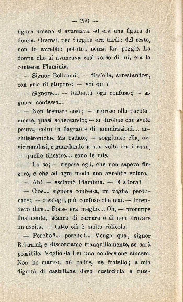 — Perchè?... perchè?... Venga qua| signor Beltrami| e discorriamo tranquillamente| se sarà possibile. Voglio da Lei una confessione sincera. Non ho marito| nè padre| nè fratello ; la mia dignità di castellana devo custodirla e tute-