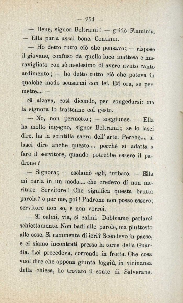 — No| non permetto ; — soggiunse. — Ella ha molto ingegno| signor Beltrami ; se lo lasci dire| ha la scintilla sacra dell' arte. Perchè.... si lasci dire anche questo.... perchè si adatta a fare il servitore| quando potrebbe essere il padrone ?