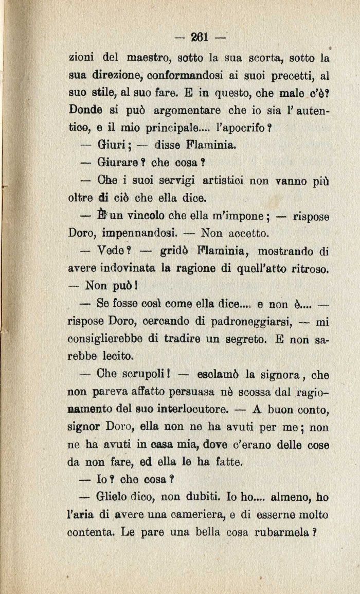 — Se fosse così come ella dice.... e non è.... — rispose Doro| oercando di padroneggiarsi| — mi consiglierebbe di tradire un segreto. E non sarebbe lecito.