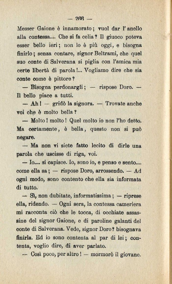 — SI| non dubitate| informatissima ; — riprese ella| ridendo. — Ogni sera| la contessa cameriera mi racconta oiò ohe le tocca| di ocohiate assassine del signor Gaione| e di paroline galanti del conte di Salverana. Vede| signor Doro? bisognava finirla. Ed io sono contenta al par di lei ; contenta| voglio dire| di aver parlato.