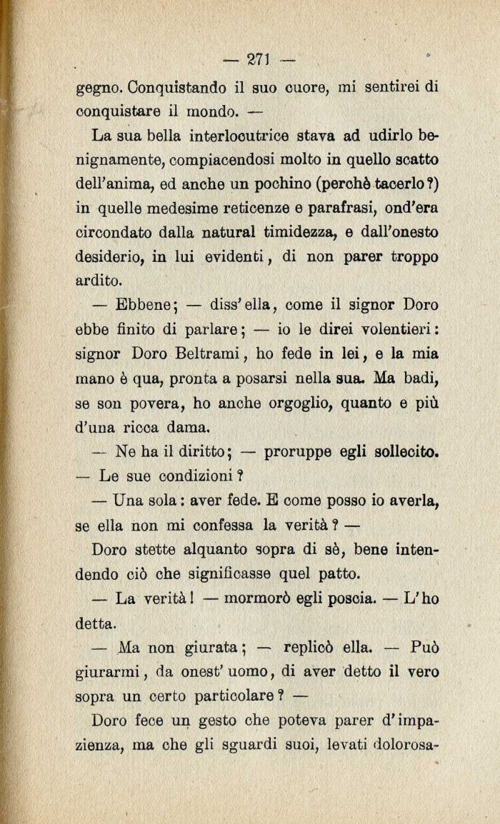 — Ebbene; — diss'ella| come il signor Doro ebbe finito di parlare ; — io le direi volentieri : signor Doro Beltrami| ho fede in lei| e la mia mano è qua| pronta a posarsi nella sua. Ma badi| se son povera| ho anche orgoglio| quanto e più d'una ricoa dama.