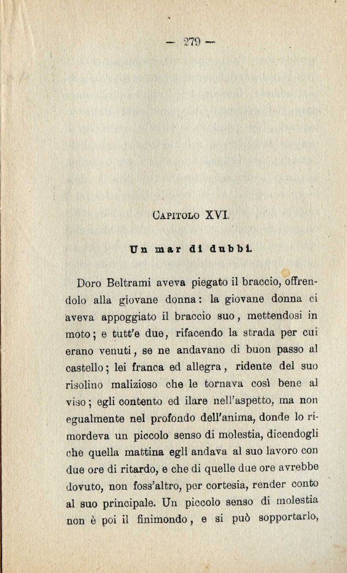 Doro Beltrami aveva piegato il braccio| offrendolo alla giovane donna : la giovane donna ci aveva appoggiato il braccio suo| mettendosi in moto; e tutt'e due| rifacendo la strada per cui erano venuti| se ne andavano di buon passo al castello ; lei franca ed allegra| ridente del suo risolino malizioso che le tornava così bene al viso ; egli contento ed ilare nell'aspetto| ma non egualmente nel profondo dell'anima| donde lo rimordeva un piccolo senso di molestia| dicendogli che quella mattina egli andava al suo lavoro con due ore di ritardo| e che di quelle due ore avrebbe dovuto| non foss'altro| per cortesia| render conto al suo principale. Un piccolo senso di molestia non è poi il finimondo| e si può sopportarlo|