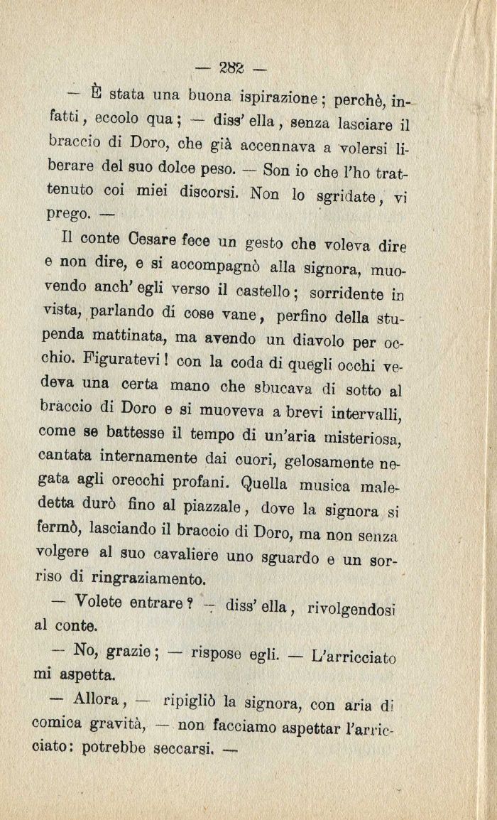 Il conte Cesare fece un gesto che voleva dire e non dire| e si accompagnò alla signora| muovendo anch' egli verso il castello ; sorridente in vista| parlando di cose vane| perfino della stupenda mattinata| ma avendo un diavolo per occhio. Figuratevi ! con la coda di quegli occhi vedeva una certa mano che sbucava di sotto al braccio di Doro e si muoveva a brevi intervalli| come se battesse il tempo di un'aria misteriosa| cantata internamente dai cuori| gelosamente negata agli orecchi profani. Quella musica maledetta durò fino al piazzale| dove la signora si fermò| lasciando il braccio di Doro| ma non senza volgere al suo cavaliere uno sguardo e un sorriso di ringraziamento.