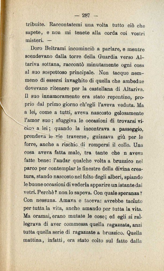 Doro Beltrami incominciò a parlare| e mentre scendevano dalla torre della Guardia verso Altariva sottana| racoontò minutamente ogni cosa al suo sospettoso principale. Non tacque nemmeno di essersi invaghito di quella che ambedue dovevano ritenere per la castellana di Altariva. Il suo innamoramento era stato repentino| proprio dal primo giorno ch'egli l'aveva veduta. Ma a lei| come a tutti| aveva nascosto gelosamente l'amor suo ; sfuggiva le occasioni di trovarsi vicino a lei ; quando la inoontrava a passeggio| prendeva le vie traverse| guizzava giù per le forre| anche a rischio di rompersi il collo. Una cosa aveva fatta male| tra tante che n aveva fatte bene: l'andar qualche volta a bruzzico nel parco per contemplar le finestre della divina creatura| stando nascosto nel folto degli alberi| spiando le buone occasioni di vederla apparire un istante dai vetri. Perchè ? non lo sapeva. Con quale speranza ? Con nessuna. Amava e taceva: avrebbe taoiuto per tutta la vita| anche amando per tutta la vita. Ma oramai| erano mutate le cose ; ed egli si rallegrava di aver commessa quella ragazzata| anzi tutta quella seria di ragazzate a bruzzico. Quella mattina| infatti| era stato colto sul fatto dalla