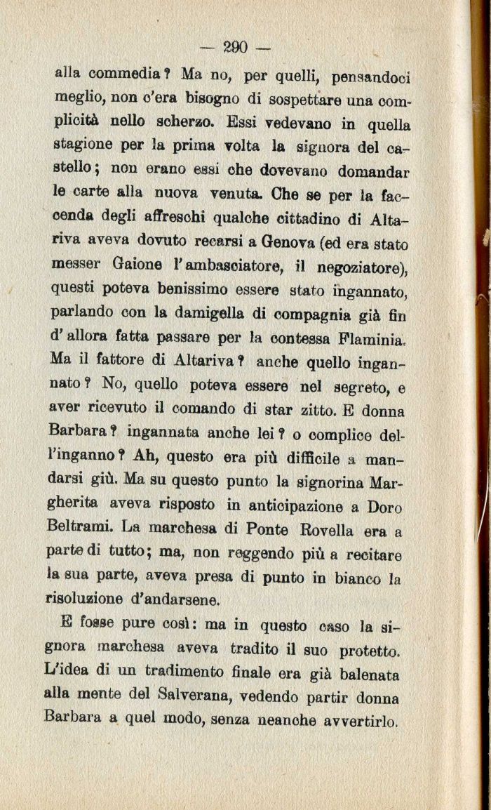 E fosse pure così: ma in questo caso la signora marchesa aveva tradito il suo protetto. L'idea di un tradimento finale era già balenata alla mente del Salverana| vedendo partir donna Barbara a quel modo| senza neanche avvertirlo.