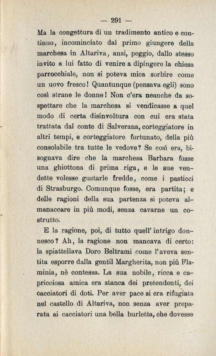 E la ragione| poi| di tutto quell' intrigo donnesco? Ah| la ragione non mancava di certo: la spiattellava Doro Beltrami come l'aveva sentita esporre dalla gentil Margherita| non pių Flaminia| nč contessa. La sua nobile| ricca e capricciosa amica era stanca dei pretendenti| dei cacciatori di doti. Per aver pace si era rifugiata nel castello di Altariva| non senza aver preparata ai cacciatori una bella burletta| ohe dovesse