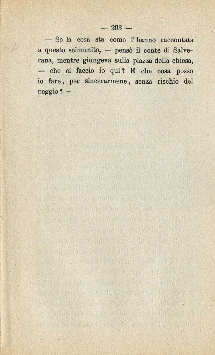 — 293 - — Se la cosa sta come l'hanno raccontata a questo scimunito| — penṣ il conte di Salve-rana| mentre giungeva sulla piazza della chiesa| — che ci faccio io qui ? B che cosa posso io fare| per sincerarmene| senza rischio del peggio? -