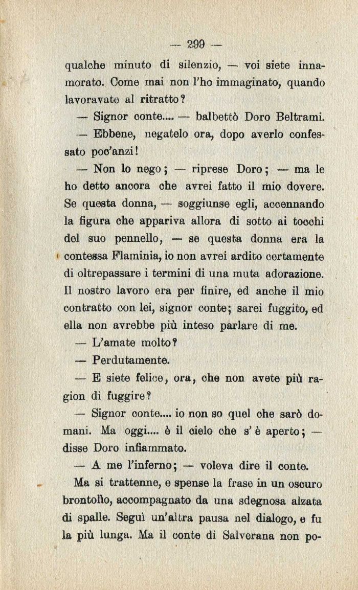 — Signor conte.... io non so quel ohe sarò domani. Ma oggi.... è il oielo ohe s' è aperto ; — disse Doro infiammato.