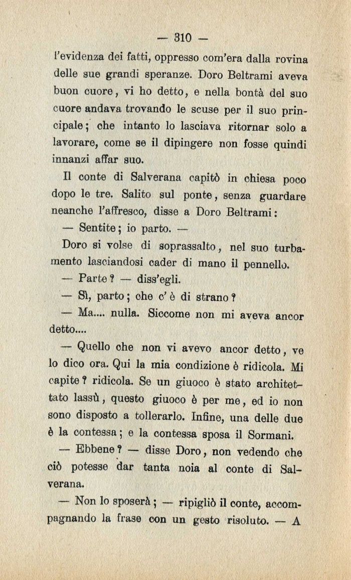 — Quello ohe non vi avevo ancor detto| ve lo dico ora. Qui la mia condizione è ridicola. Mi capite? ridicola. Se un giuoco è stato architettato lassù| questo giuoco è per me| ed io non sono disposto a tollerarlo. Infine| una delle due è la contessa ; e la contessa sposa il Sormani.