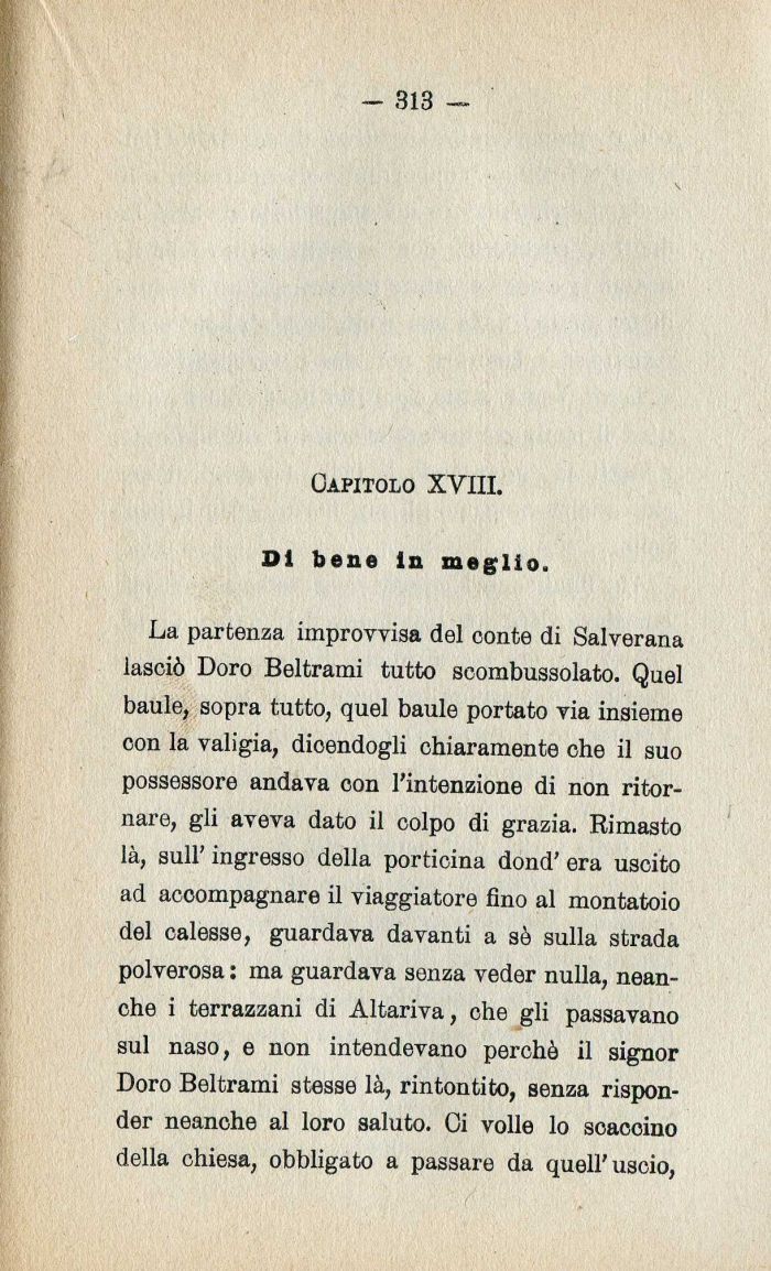 La partenza improvvisa del conte di Salverana lasciò Doro Beltrami tutto scombussolato. Quel baule| sopra tutto| quel baule portato via insieme con la valigia| dicendogli chiaramente che il suo possessore andava con l'intenzione di non ritornare| gli aveva dato il colpo di grazia. Rimasto là| sull' ingresso della porticina dond' era uscito ad accompagnare il viaggiatore fino al montatoio del calesse| guardava davanti a sò sulla strada polverosa : ma guardava senza veder nulla| neanche i terrazzani di Altariva| che gli passavano sul naso| e non intendevano perchò il signor Doro Beltrami stesse là| rintontito| senza risponder neanche al loro saluto. Ci volle lo soacoino della chiesa| obbligato a passare da quell'uscio|