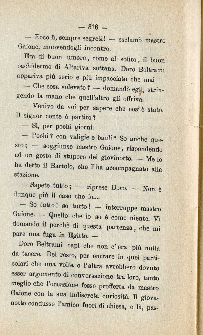 Doro Beltrami capì che non c' era più nulla da tacere. Del resto| per entrare in quei particolari che una volta 0 l'altra avrebbero dovuto esser argomento di conversazione tra loro| tanto meglio che l'occasione fosse profferta da mastro Gaione con la sua indiscreta curiosità. Il giovanotto condusse l'amico fuori di chiesa| e là| pas-