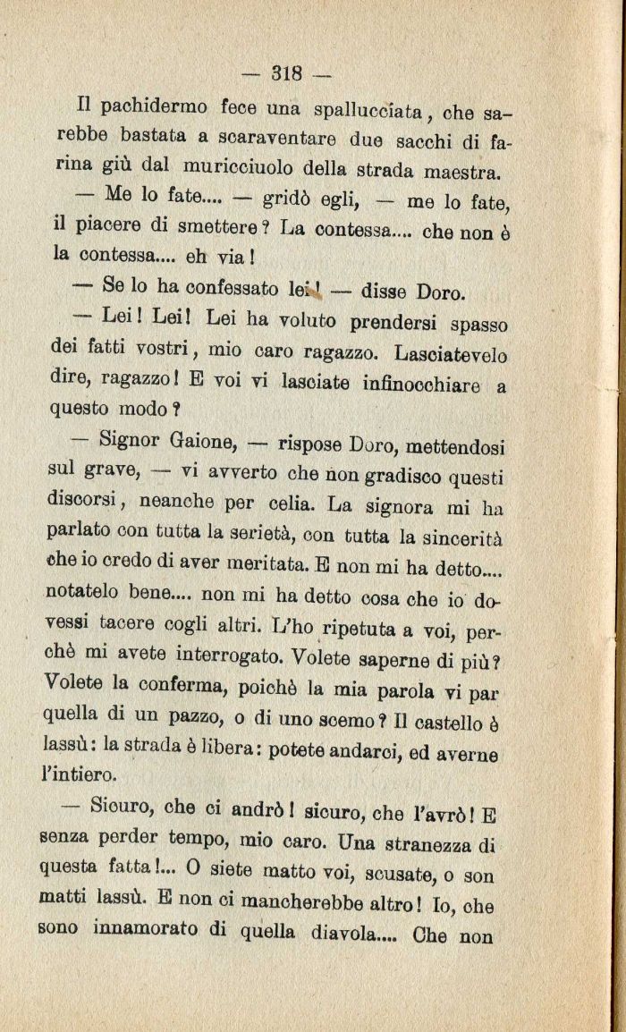 — Signor Gaione| — rispose Doro| mettendosi sul grave| — vi avverto che non gradisco questi discorsi| neanche per celia. La signora mi ha parlato oon tutta la serietà| oon tutta la sincerità che io credo di aver meritata. E non mi ha detto.... notatelo bene.... non mi ha detto cosa che io dovessi tacere cogli altri. L'ho ripetuta a voi| per-ohè mi avete interrogato. Volete saperne di più? Volete la conferma| poiohò la mia parola vi pai-quella di un pazzo| o di uno scemo ? Il castello è lassù: la strada è libera: potete andarci| ed averne l'intiero.