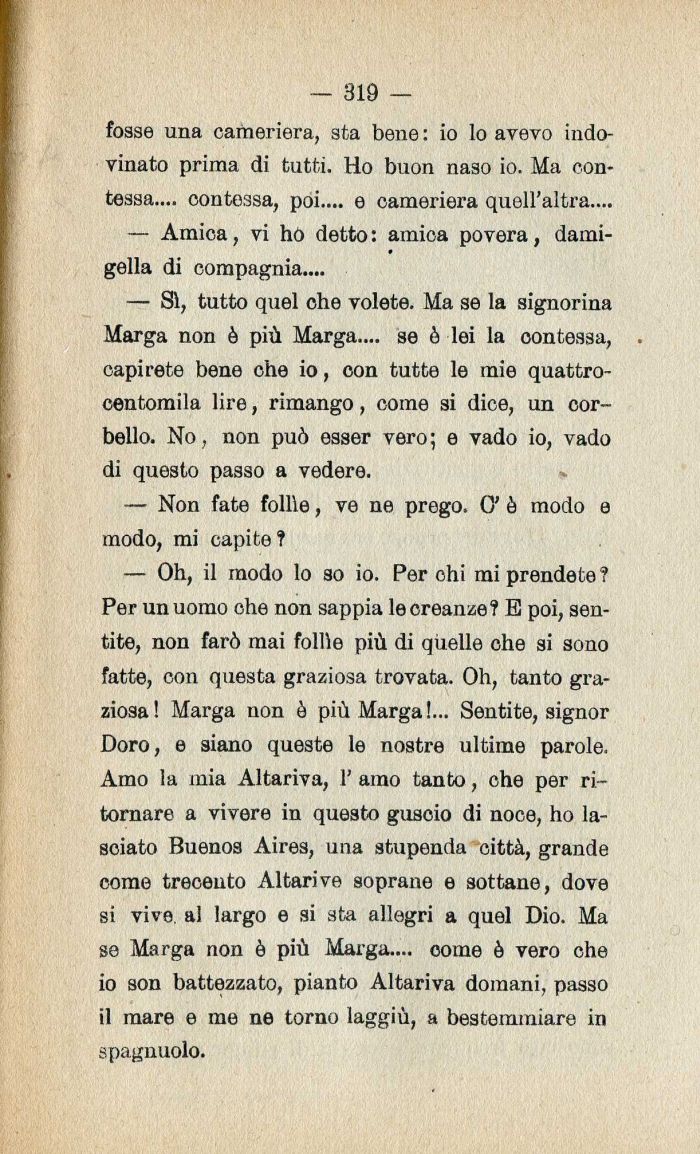 — Sì| tutto quel che volete. Ma se la signorina Marga non è più Marga.... se ò lei la oontessa| capirete bene che io| con tutte le mie quattrocentomila lire| rimango| come si dice| un corbello. No| non può esser vero ; e vado io| vado di questo passo a vedere.